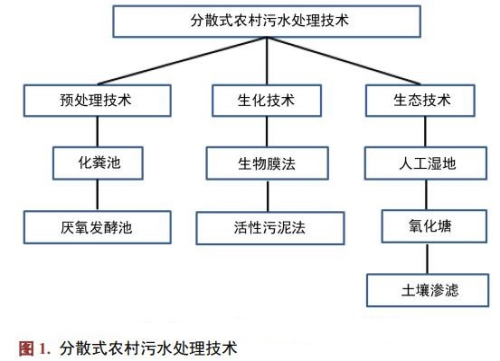 分散式农村生活污水治理技术的遴选应遵循“达标排放、运行稳定、管理简便、耐冲击负荷、建设及运行成本经济”等原则,同时考虑处理后尾水可实现资源化利用,并且易于实现设备化。农村生活污水处理按照流程及净化原理,可分为预处理技术、生物处理技术、生态处理技术。如下图1所示: