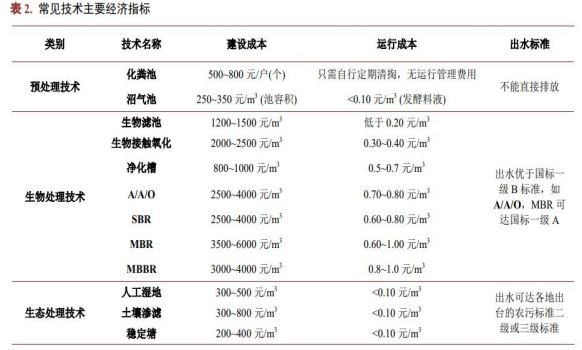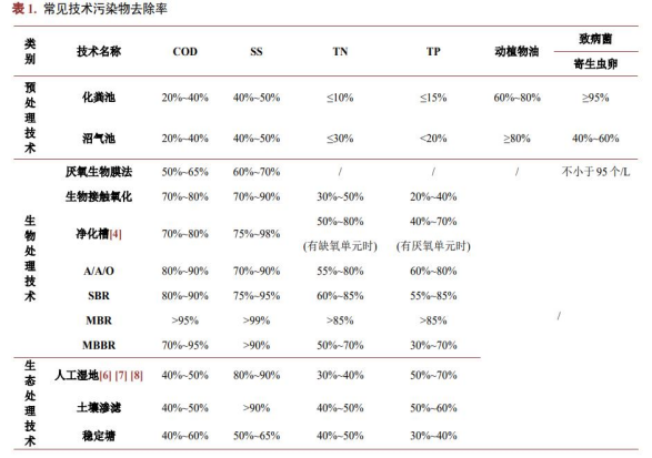 由上表可知,对污染物去除率较高的为生物处理技术,而应用于分散式农村生活污水治理方面的一体化设备,主要是各个生物处理技术的有机组合。