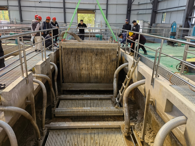 ②外浸渍化学清洗如没采用吊车吊到外面进行清洗,需单组拉上来进行清洗,由于膜表面附有部分污泥,拉上来时膜组件会很重,为防止损坏膜片连接件,需特别小心(特别是三片装以上的膜片需要2个人操作才能完成)。如采用吊车清洗效果会不理想,附着在膜表面的污泥无法完全清洗掉。而在线化学清洗不会产生以上现象,简单方便。